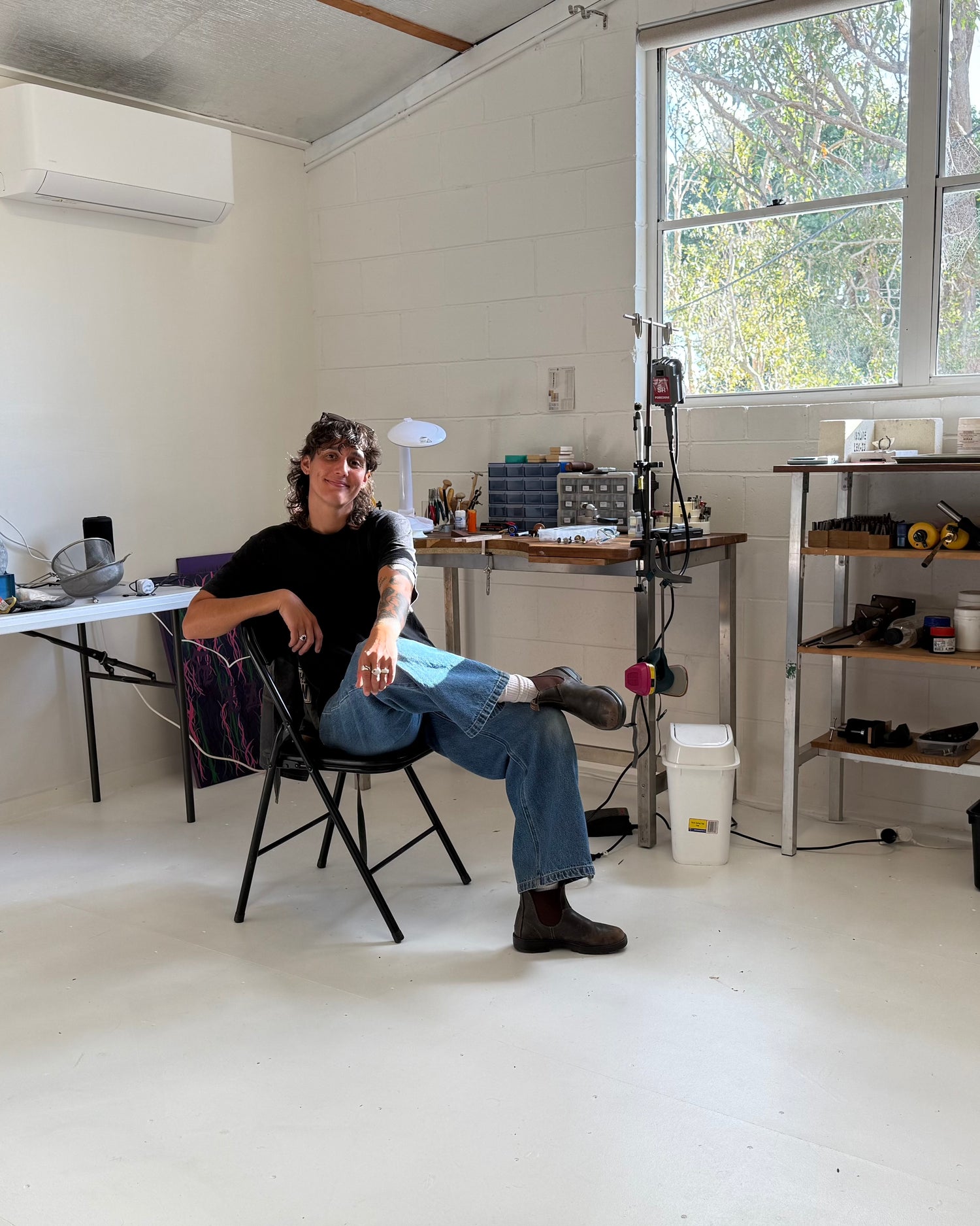 I’m Skye Roberts — a Queer Aboriginal artist from Bundjalung Country, based in Byron Bay. I got into jewellery-making in 2024 after a surf accident left me stuck at home. I needed something to keep my hands (and mind) busy, so I ordered a few basic tools online and started experimenting at the kitchen table of my share house. What began as a way to pass the time quickly turned into an obsession, and found myself investing every waking hour into refining my craft.