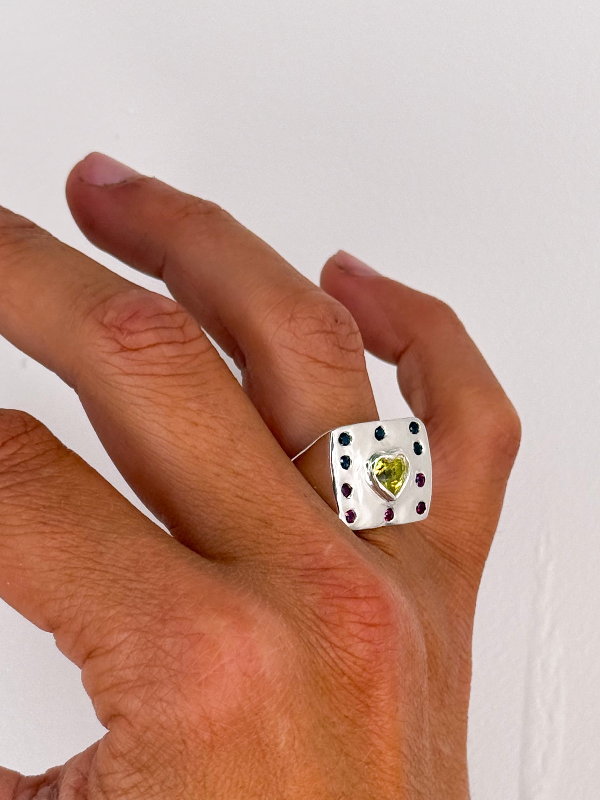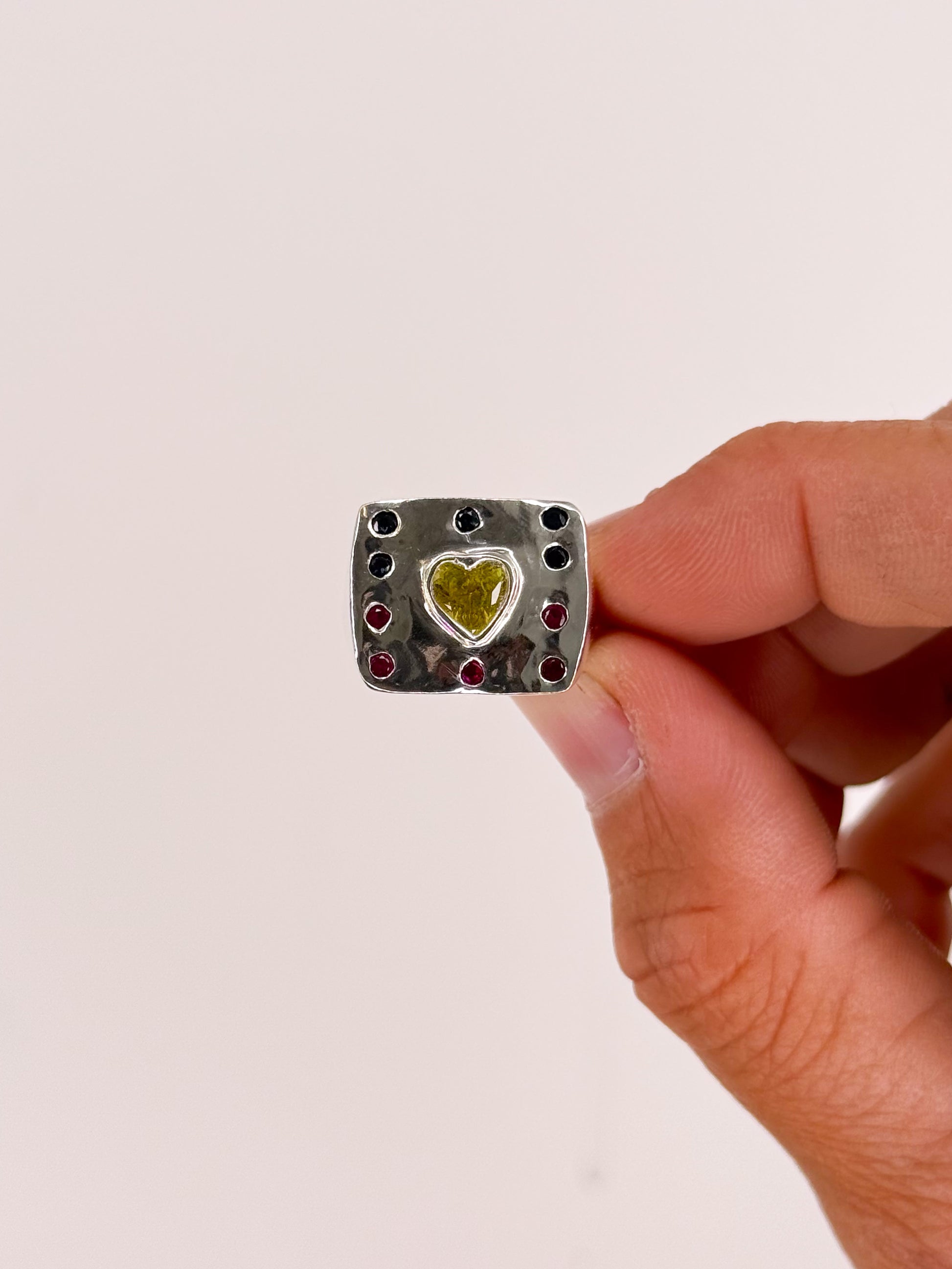 Set with an all natural Yellow Heart cut Sapphire and Lab Grown 2mm red and black sapphires