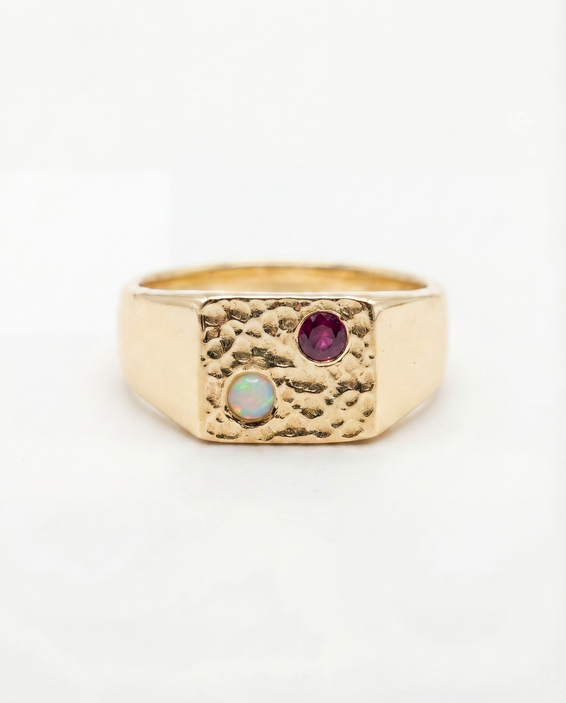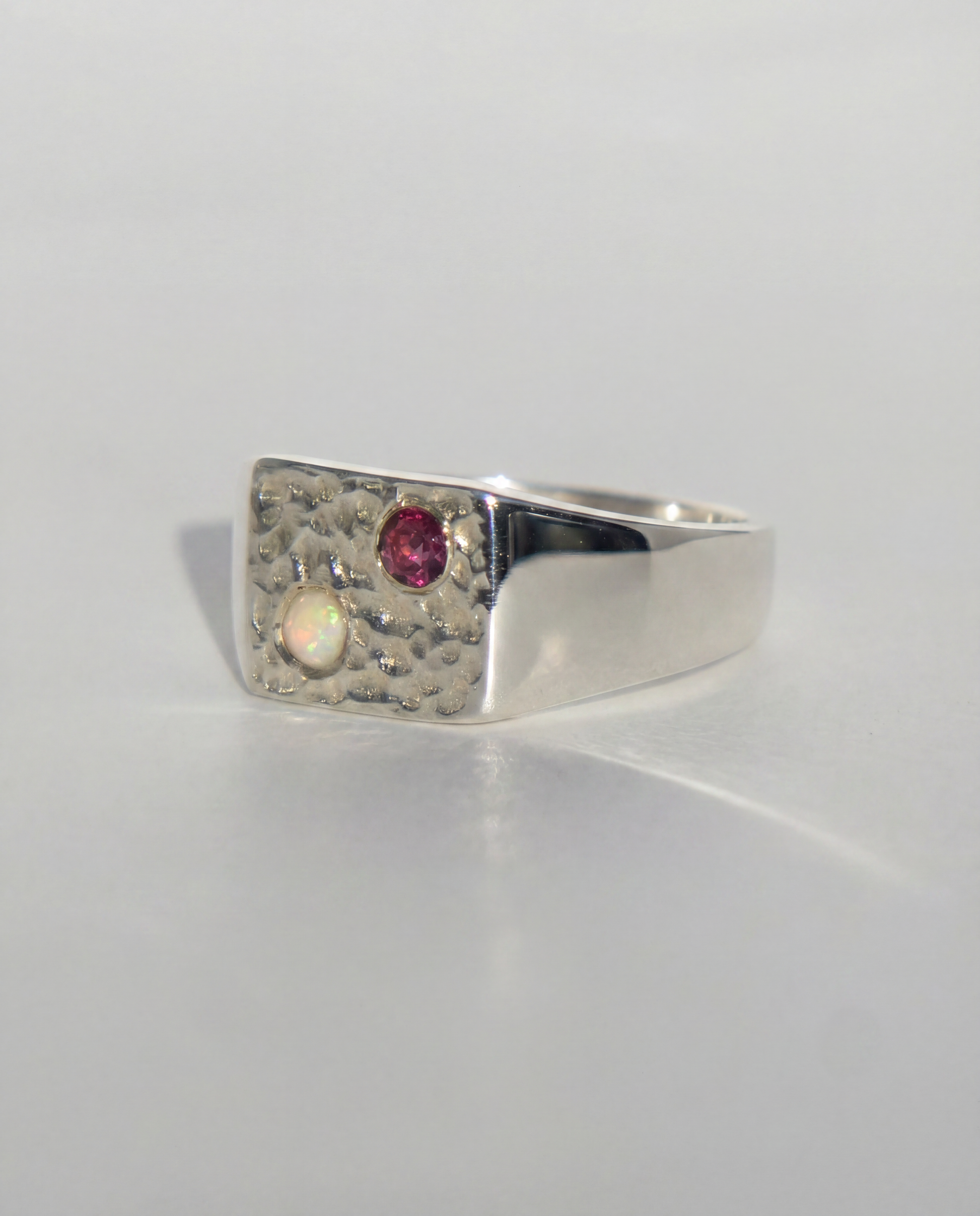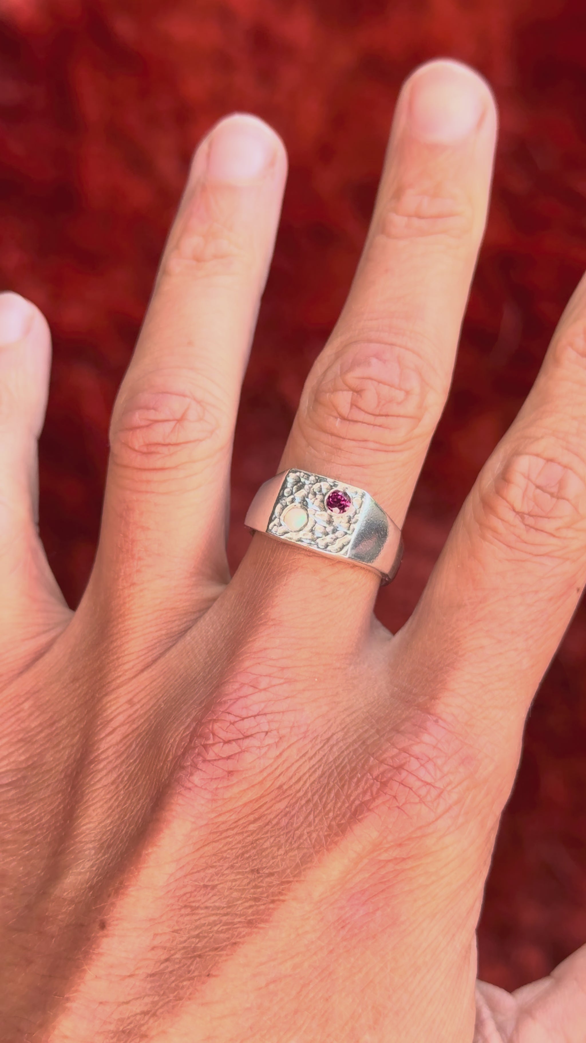 A deep garnet and a glowing opal—different energies, somehow just working.