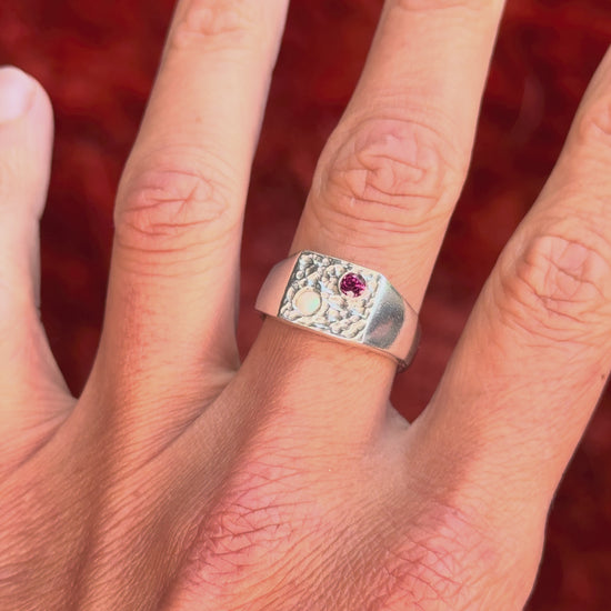 Set with a 3mm Garnet Rhodolite and Opal