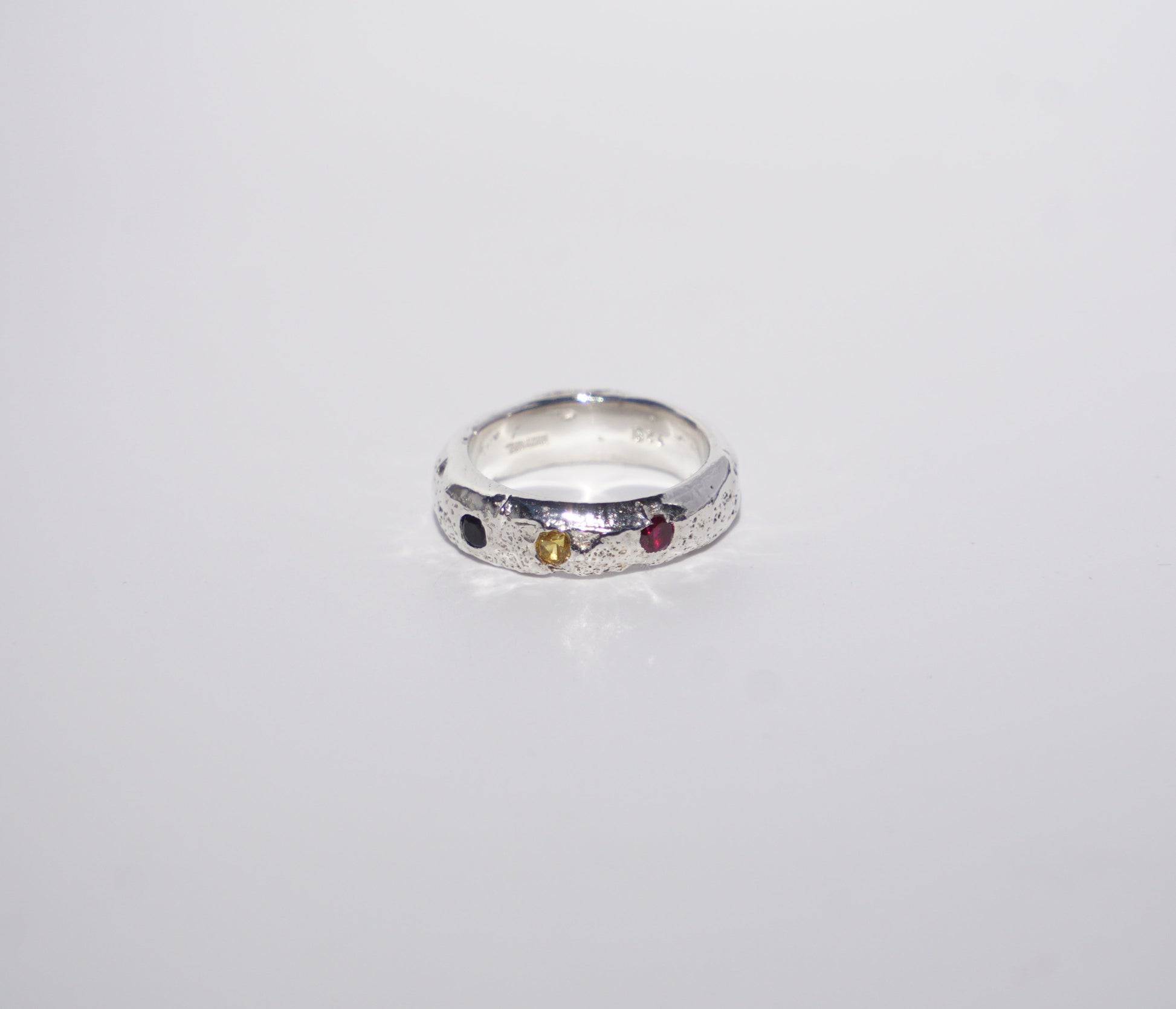 This ring was created using a process called Sand Casting, therefore each ring is entirely unique with their own textures and gem setting positioning